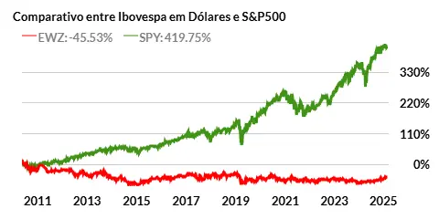 Nesse período o Ibovespa, principal índice da bolsa brasileira, acumula mais de 60% de perdas se visto em dólares, enquanto o S&P500, principal índice americano, acumula alta de mais de 400%.